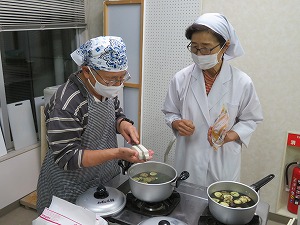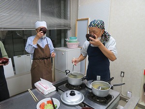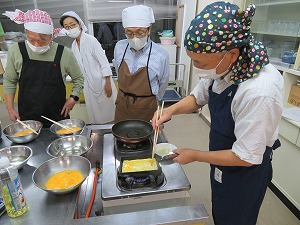 講師:食のよろず相談 出倉弘子氏メニュー:だし巻き卵(卵6個)・冬瓜と鶏肉の煮物・味噌汁(出しを変えて飲み比べ)・カルパッチョ